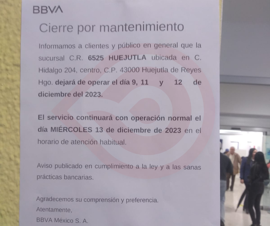 Huejutla, Hgo.- A través de oficios adheridos a la pared, personal a cargo de la Sucursal CR 6525 de Bancomer (BBAV), Huejutla, informa a clientes y público en general, que por labores de mantenimiento se suspenderá el servicio durante tres días.