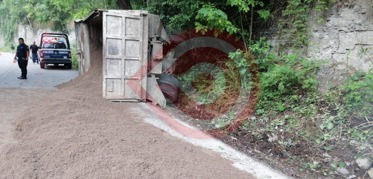 Yahualica, Hgo.- Derivado de una presunta falla mecánica, camión volteo se salió de la carretera y volcó hasta quedar totalmente recostado con toda su carga, esto sobre la carretera estatal Atlapexco – Calnali, abajo del crucero de Yahualica.