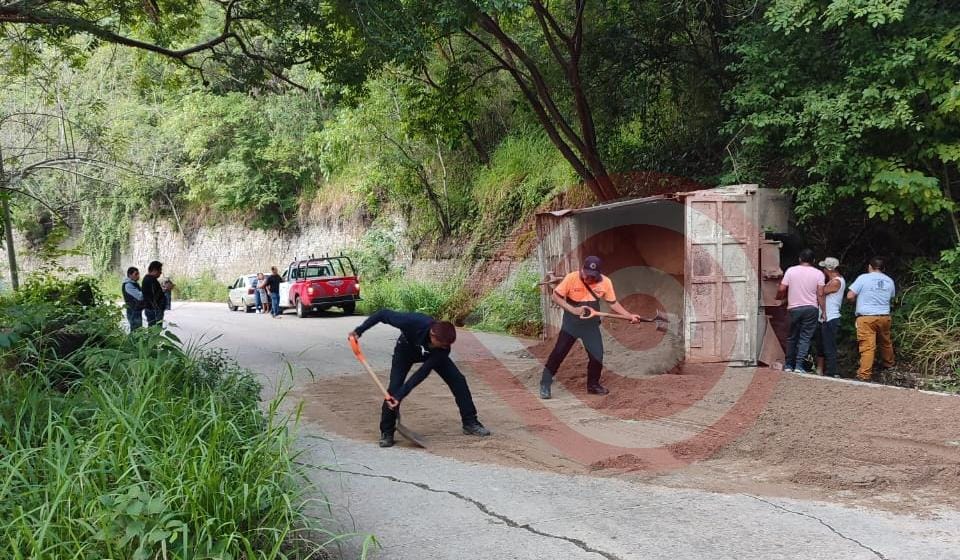 El vehículo iba con dirección a Atlapexco, pero por motivos desconocidos el conductor perdió el control del volante, se salió de camino y volcó, tirando toda la arena que llevaba y bloqueando la carretera por varias horas, se trató de un camión volteo color blanco.