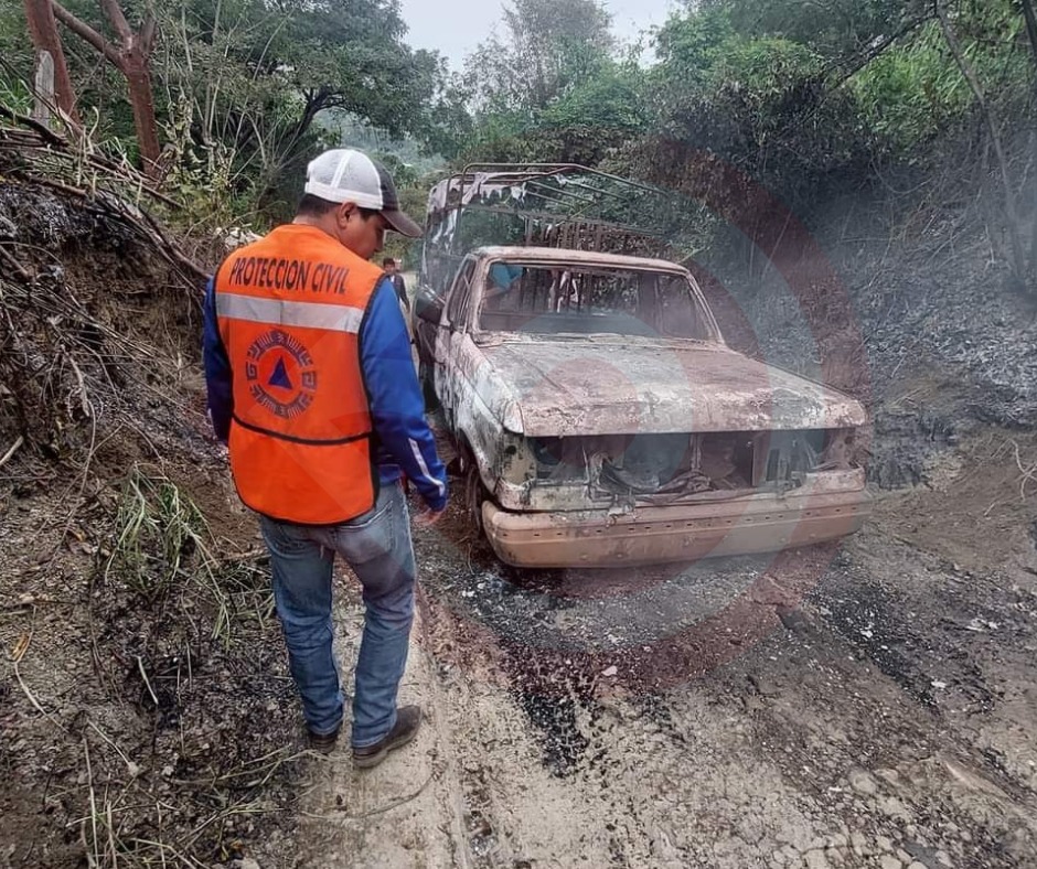 Platón Sánchez, Ver.- Por un probable corto circuito en el sistema eléctrico, una camioneta del servicio de transporte rural mixto, ardió en llamas en la carretera estatal Los Pozos – El Mirador, perteneciente a este municipio.