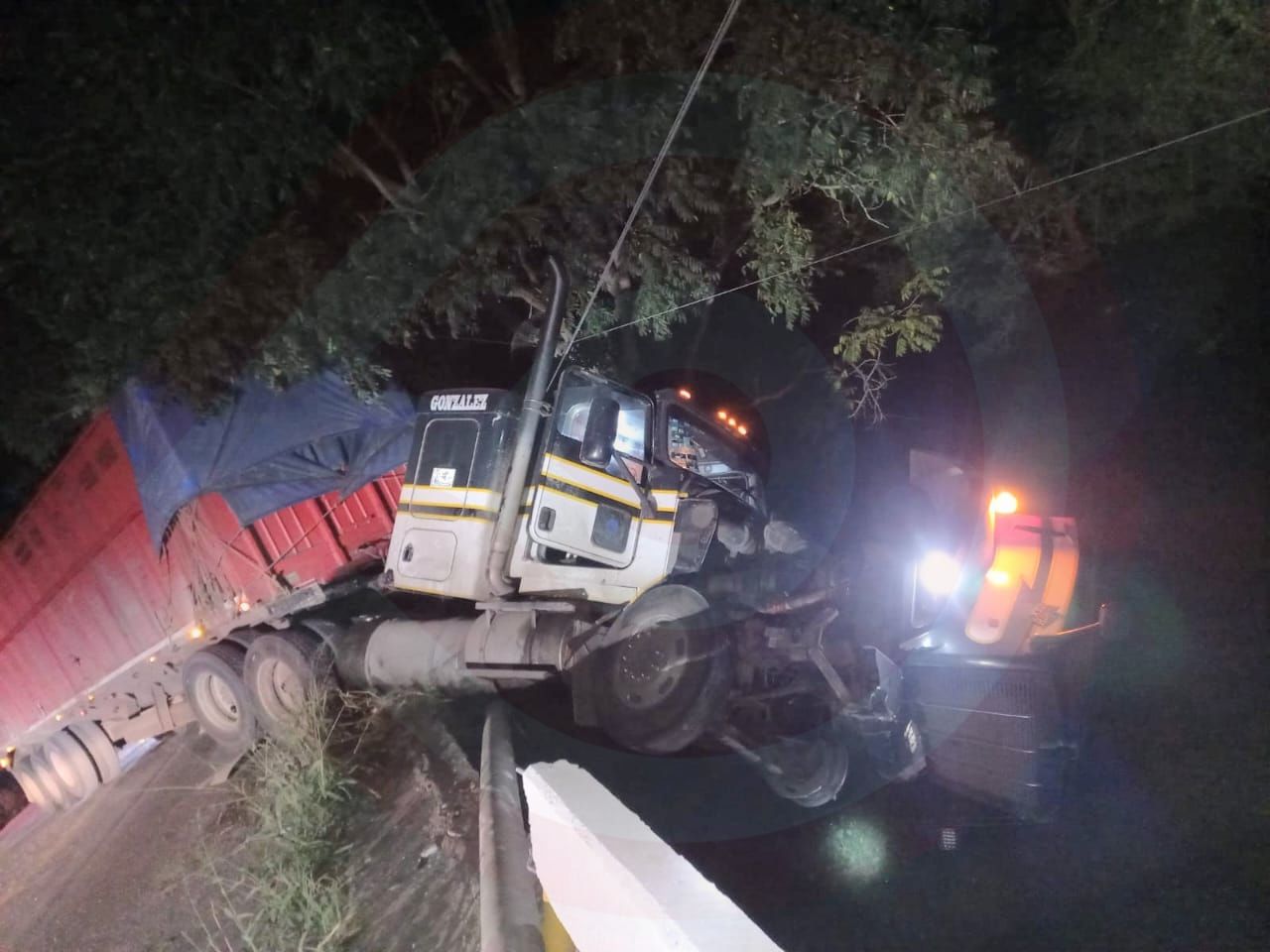 Tráiler a punto de caer de un puente