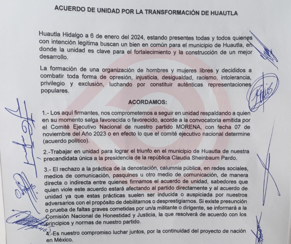 El acuerdo establece cuatro puntos en los que se comprometieron primero a seguir en unidad, respaldando a quien en su momento salga favorecido o favorecida, acorde a la convocatoria emitida por el Comité Ejecutivo Nacional del Movimiento de Regeneración Nacional; a trabajar para lograr el triunfo en el municipio de Huautla por la precandidata única a la presidencia de la república Claudia Sheinbaum Pardo.