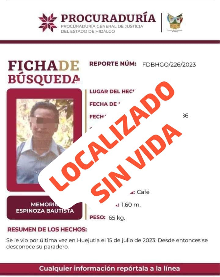 Por Francisco Rosas/Zunoticia Huejutla, Hgo.- Los restos de una persona del sexo masculino, que estaba desaparecida desde el 15 de julio del 2023, fueron localizados en el centro de la localidad de Ixcatlán, perteneciente a este municipio. El cadáver encontrado presuntamente es de Memorio Espinoza Bautista, de 37 años de edad, quien era originario de… Seguir leyendo Hallan sin vida a hombre que estaba desaparecido