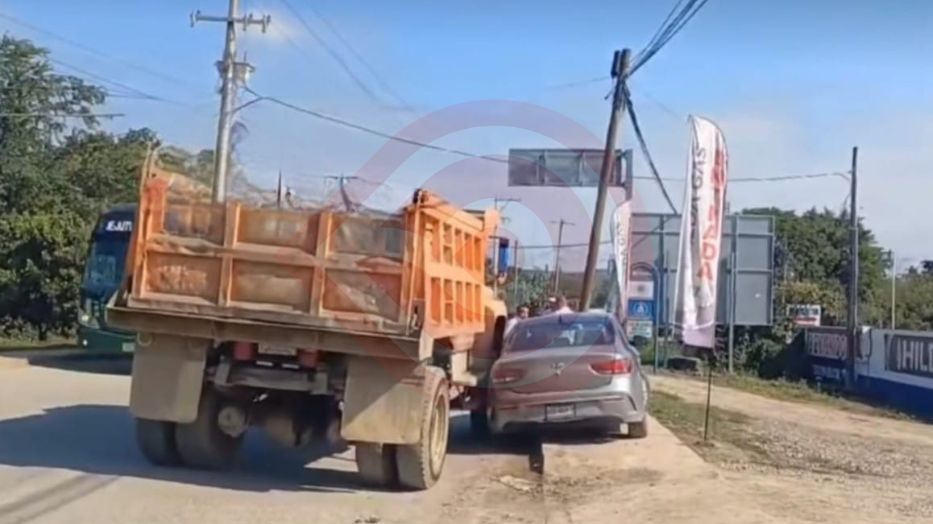 Huejutla, Hgo.- Un auto compacto que presuntamente intentó rebasar sin precaución en el bulevar central de la carretera México – Tampico fue impactado y arrastrado por un camión de volteo.