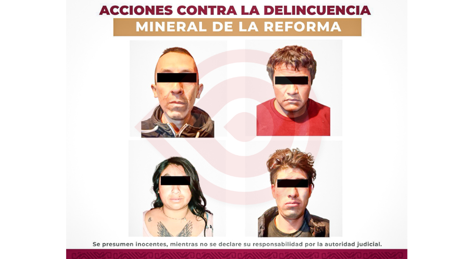 En varias viviendas de las colonias Privadas San Marcos y Rinconada de los Ángeles, pertenecientes a Mineral de la Reforma, se aseguraron a cinco personas, entre ellas, una del sexo femenino identificadas como: F. F. G., A.L.J., J A S., C G S. y un adolescente.