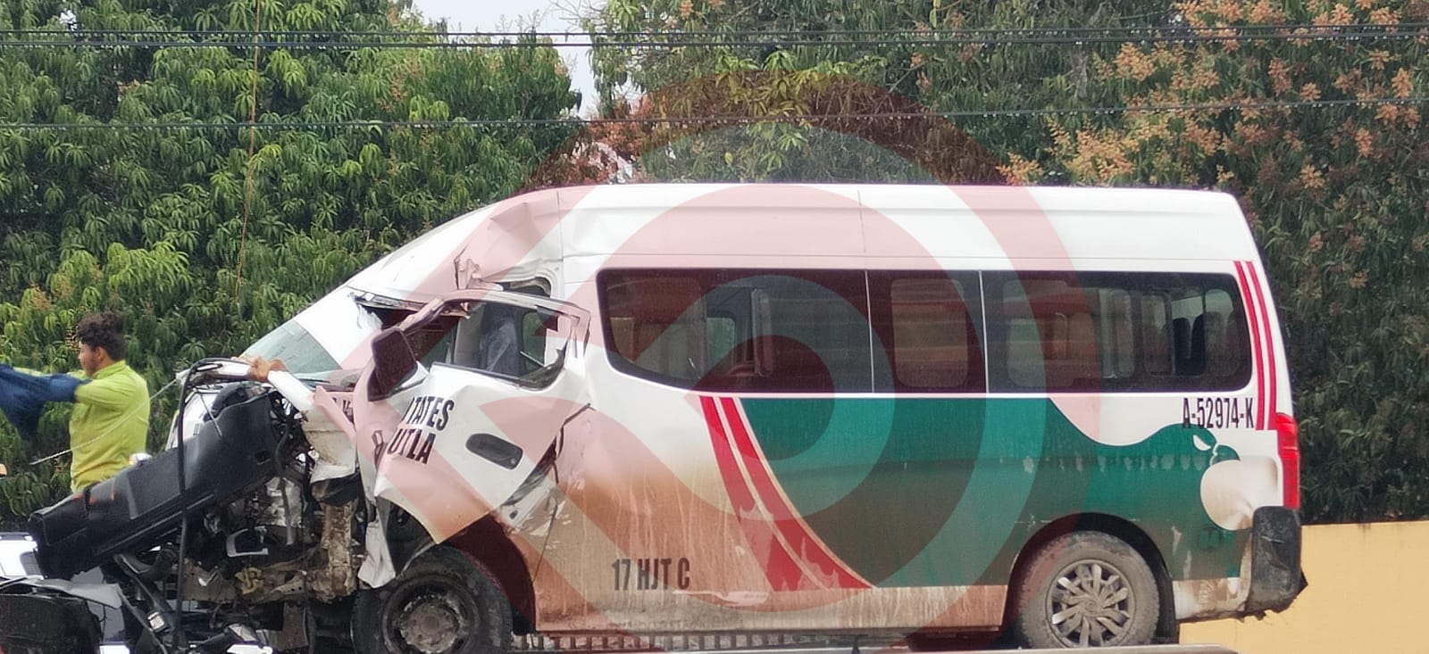 El choque ocurrió sobre la vía estatal Huejutla-Los Otates, la tarde de este sábado, entre un camión Torton que transporta 8 toneladas de naranjas y una Combi de esa ruta, el conductor de la urban fue identificado con el nombre de C. C. H., quien tuvo serias lesiones y la unida tuvo que ser recortada en varias partes para poder sacar a este individuo y llevarlo al hospital.