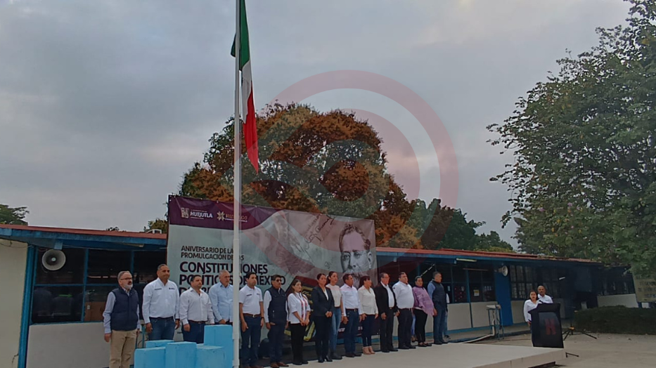 Huejutla, Hgo.- Autoridades municipales y educativas participaron en los honores e izamiento de bandera a toda asta, con motivo de la conmemoración de un aniversario más de la promulgación de las Constituciones de 1857 y 1917.