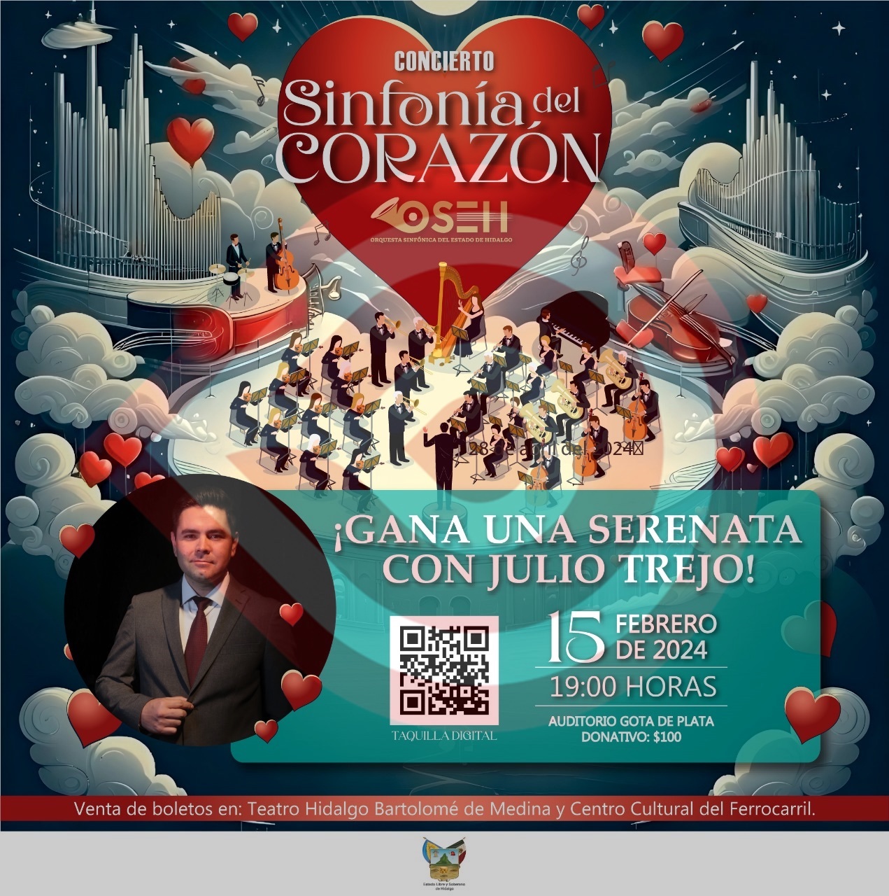 Pachuca de Soto, Hgo. – La Orquesta Sinfónica del Estado de Hidalgo (OSEH) dio a conocer que el tenor Julio Trejo regalará una serenata privada a través de una rifa que se realizará en el concierto “Sinfonía del Corazón”, el próximo jueves 15 de febrero, a las 19:00 horas, en el auditorio Gota de Plata.