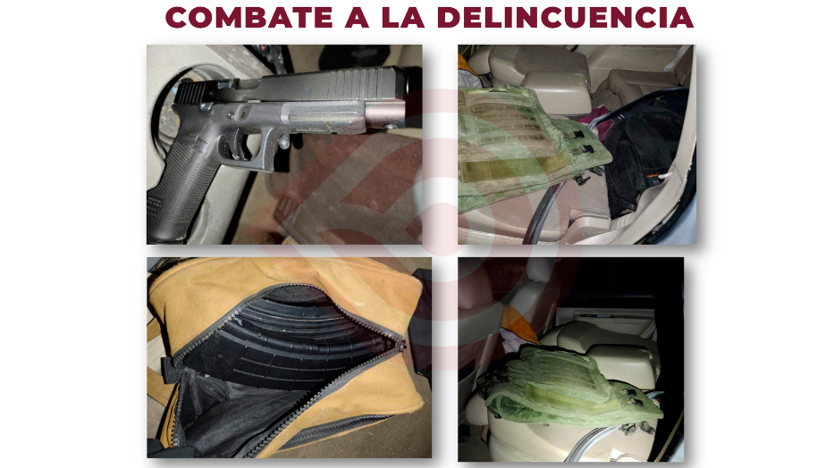 Durante la revisión fue hallada un arma corta 9 milímetros y un cargador para arma corta, ambos abastecidos, así como dos chalecos balísticos, y cuatro cargadores para arma larga.