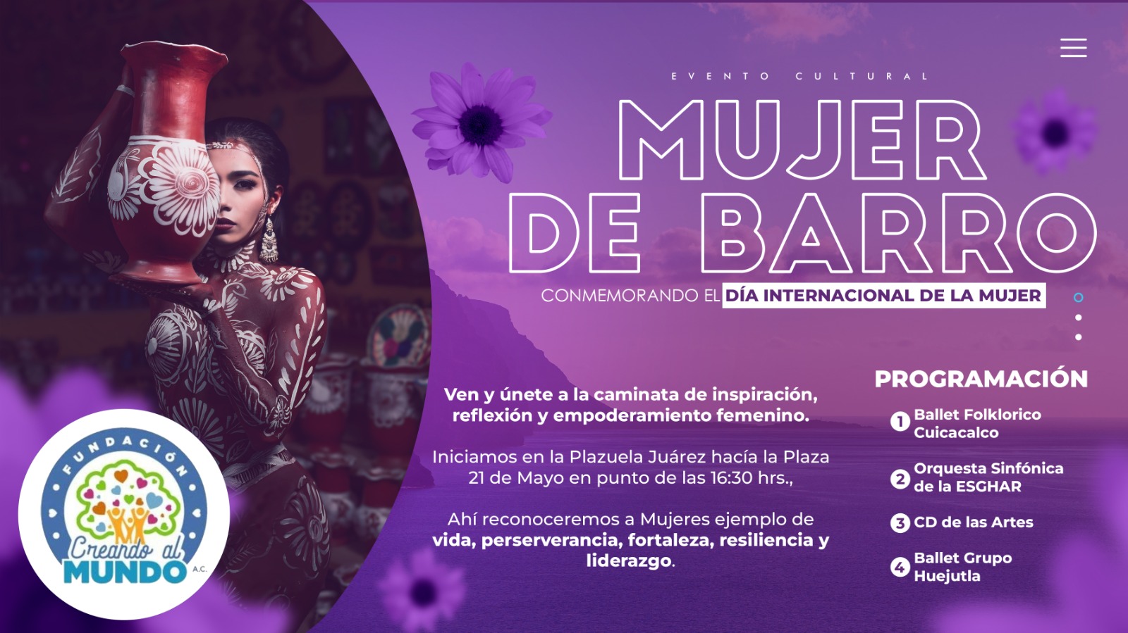 Por Moisés Medrano/Zunoticia Huejutla, Hgo.- “Mujer de Barro” es un evento cultural fomentado por la fundación Creando al Mundo, que abrió la invitación, reflexión y empoderamiento femenino, para eso se programa la participación de un ballet cultural Cuicuacalco, la orquesta sinfónica de la ESGHAR, Ciudad de las Artes y Ballet Grupo Huejutla. El evento programado… Seguir leyendo Invitan a la marcha del 8 de marzo Día de la Mujer