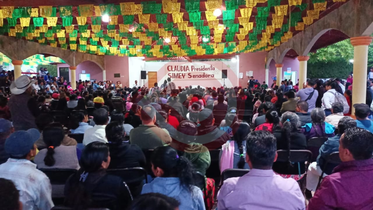 Atlapexco, Hgo.- La candidata al Senado de la República, Simey Olvera, en un mitin político realizado en la galera del centro, fue arropada por mamá “Chelo”, la estructura del pueblo y presentó a su huehue (viejo).