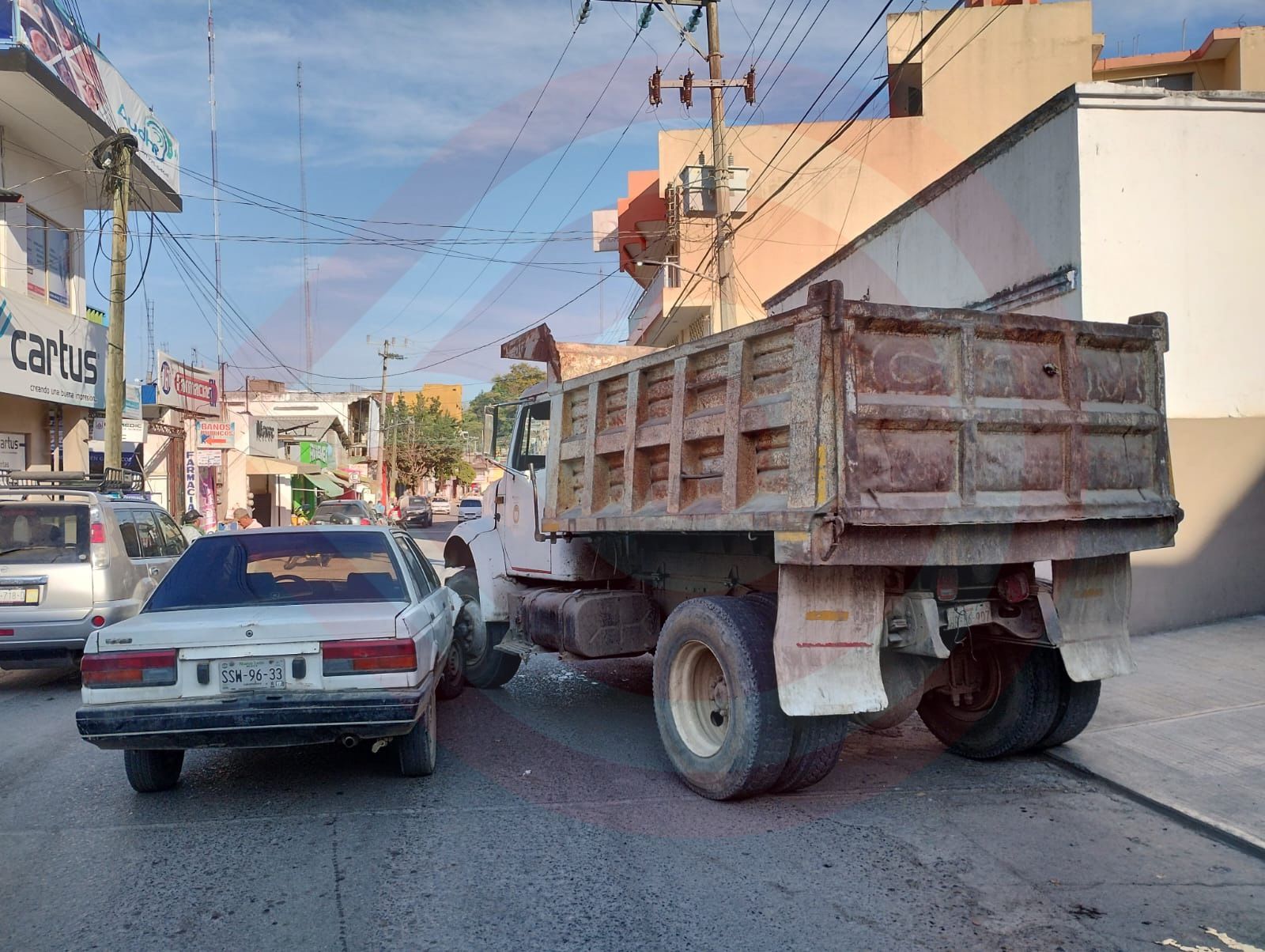 Huejutla, Hgo.- Por falta de precaución de uno de los conductores, un camión materialista y un auto compacto, chocaron lateralmente la tarde de este martes, en la calle Morelos de la zona centro de esta ciudad.