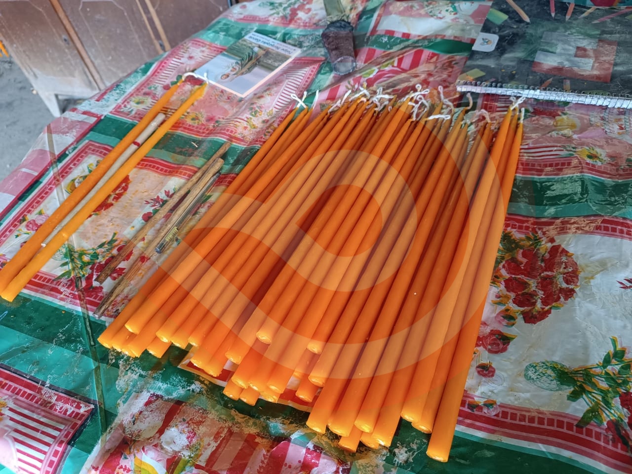 En esta temporada de semana santa el señor Enrique elabora velas blancas, cirios pascuales con cera pura natural y las tradicionales velas amarillas, desde las más pequeñas hasta el tamaño mas grande.