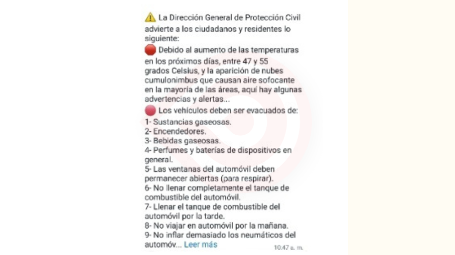Recientemente se detectó un mensaje falso que circula en WhatsApp, donde se informa sobre altas temperaturas y las acciones a tomar; circular que carece de veracidad, además de que hace uso indebido del nombre de una dependencia gubernamental.