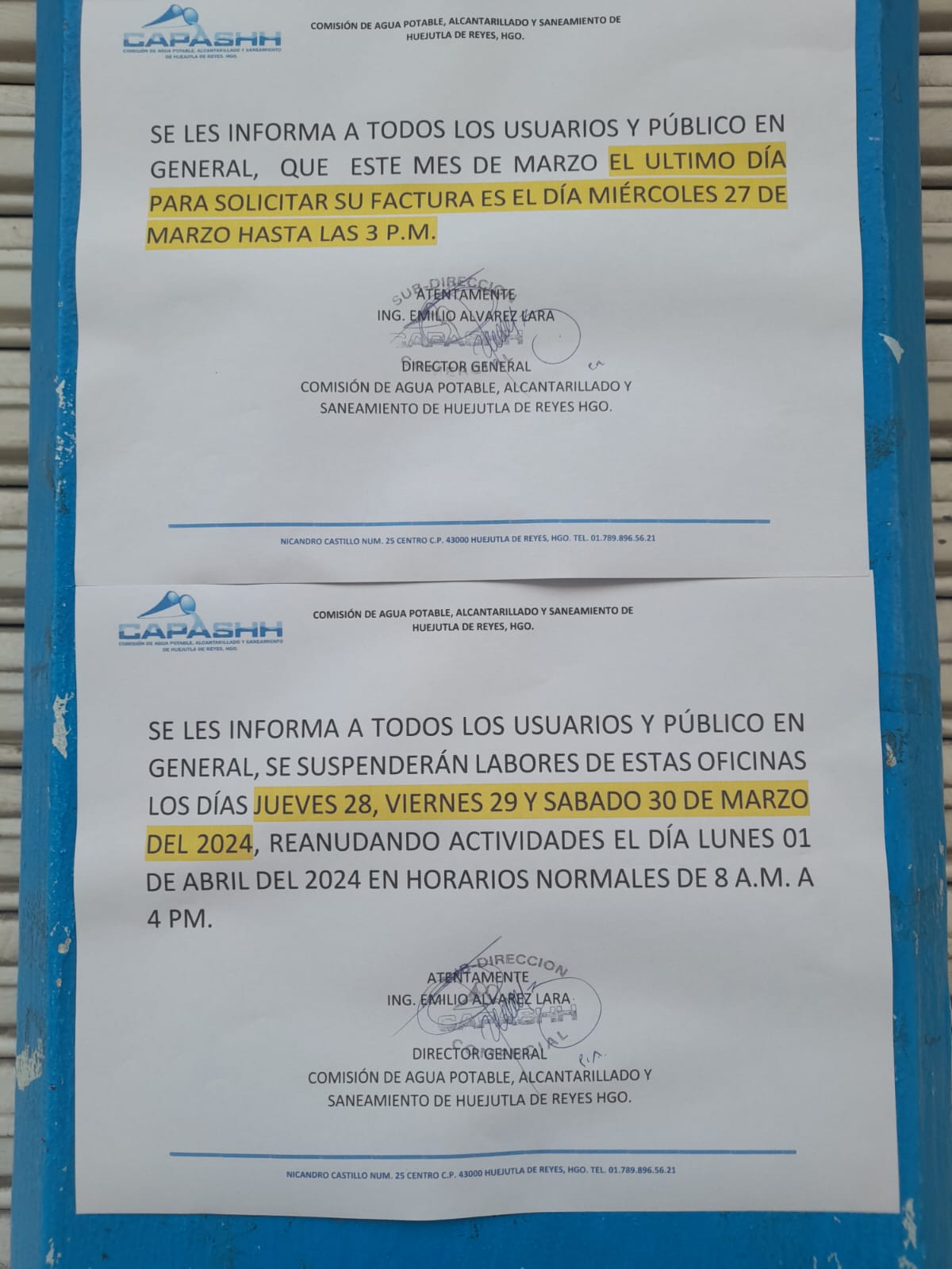 Huejutla, Hgo.- Por motivo del periodo vacacional de Semana Santa, la Comisión de Agua Potable Alcantarillado y Saneamiento de Huejutla, Hidalgo (CAPASHH), cuyo director es Emilio Álvarez Lara, suspenderá durante tres días el servicio de oficina.