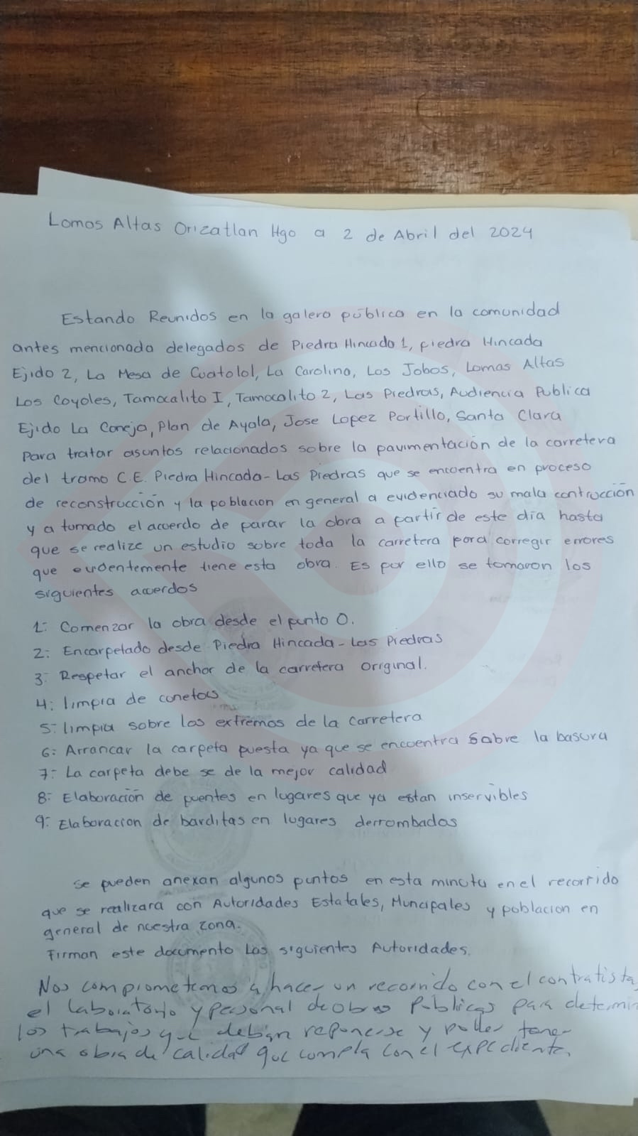 Cabe agregar que los delegados levantaron una minuta donde refieren sus observaciones y hacen del conocimiento a las autoridades municipales y estatales el mal trabajo de la empresa responsable de la obra que consiste en rehabilitación y modernización del tramo carretero en mención y estiman diferentes puntos en los que sustentan sus observaciones como el que no se instalará base a la obra.