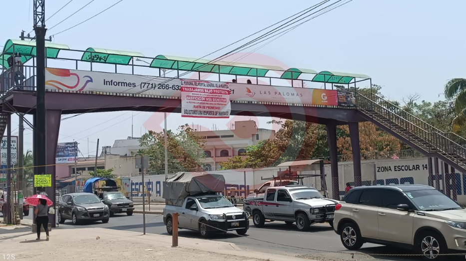 Huejutla, Hgo – Por los barandales del “puente peatonal” de la carretera federal México Tampico, a la altura del mercado municipal de Huejutla de Reyes, fue colocada una gran lona en donde personal del Hospital General de la Huasteca informa que en el nosocomio se trabaja bajo protesta, además de pedir la basificación del IMSS Bienestar.