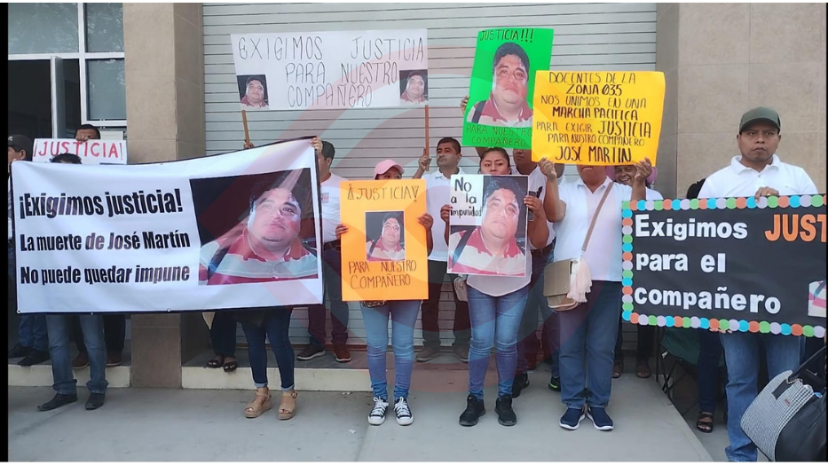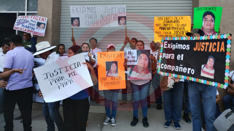 Gritando consignas, portando lonas y cartulinas, los docentes se apostaron afuera de la dependencia de procuración de justicia, como medida de presión para que las autoridades ministeriales esclarezcan los hechos ocurridos el pasado 12 de marzo del año en curso, un vehículo provocó la muerte de José Martín, quien era vecino de la localidad de Tecorral, perteneciente a este municipio.
