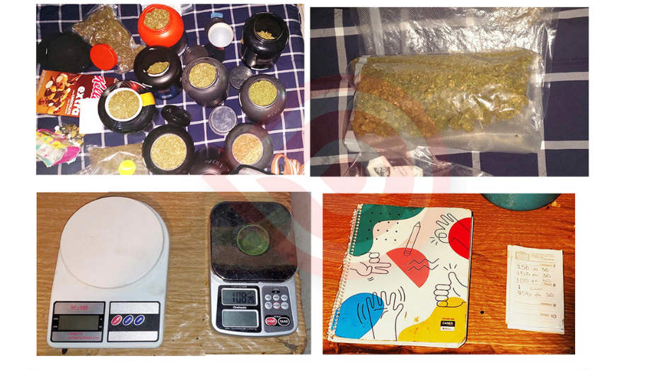 Resultado del cateo, se hallaron 16 mil 677 dosis de presunta marihuana, mil 670 de posible droga sintética con características de metanfetaminas y 167 más de polvo blanco, presumiblemente cocaína, así como básculas de precisión, libretas con notas de venta y equipo tecnológico.