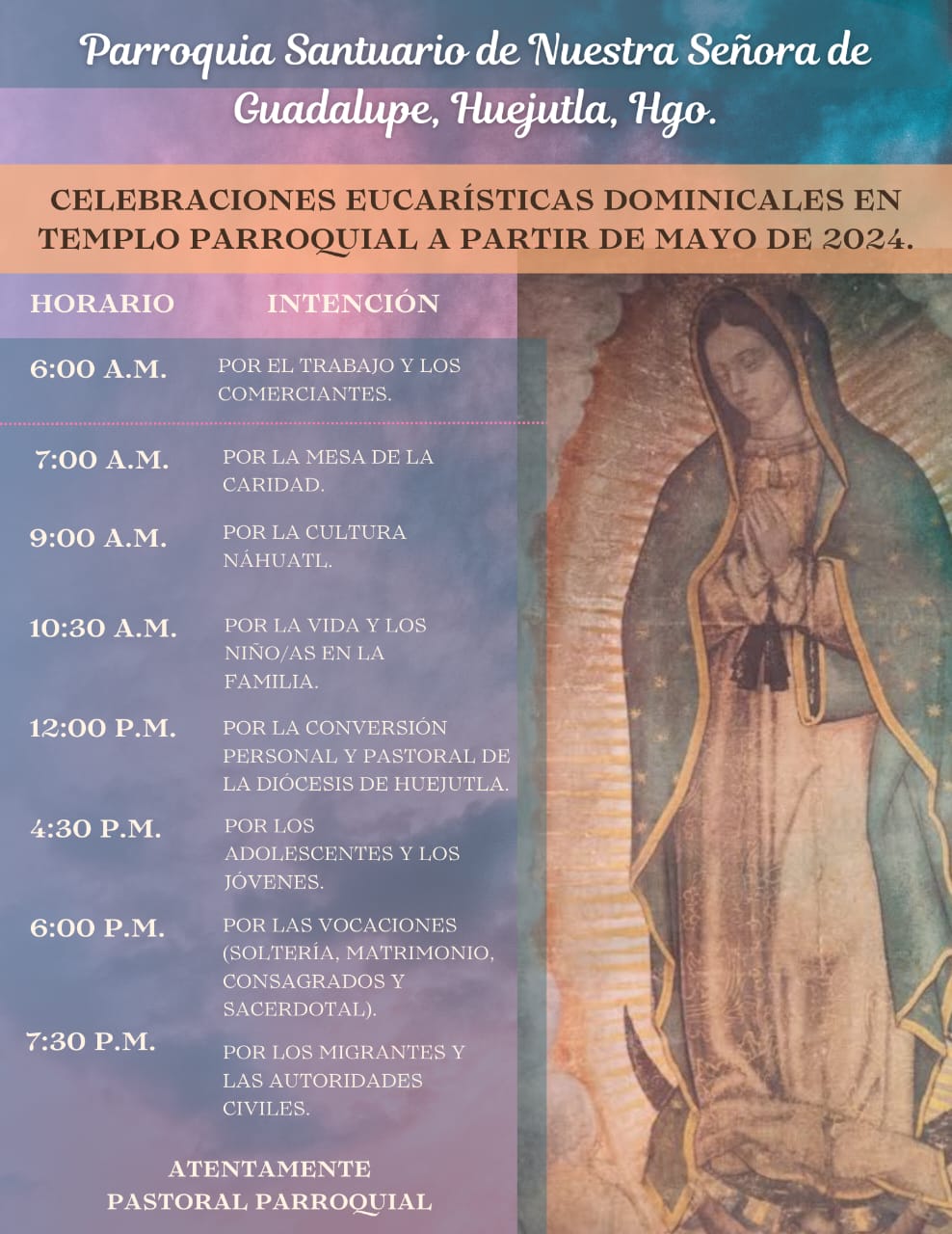 El nuevo horario entra en vigencia a partir del domingo 5 de mayo, y la idea principal es brindar una mejor atención para quienes llegan temprano, además se implementa la misa en náhuatl a las 9:00 horas.