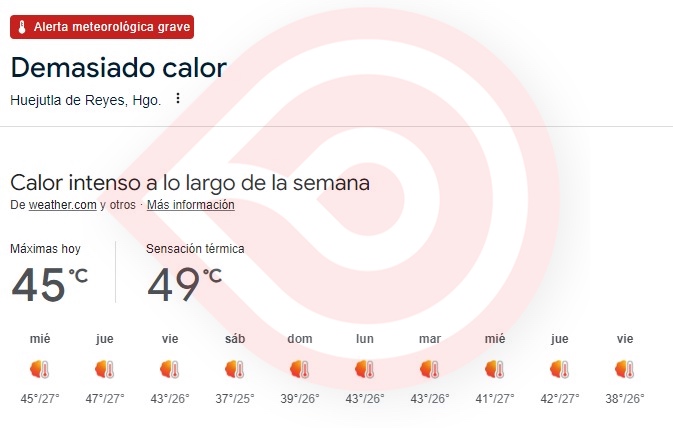 Este miércoles 8 de mayo en Huejutla el termómetro marcaba los 45 grados, con una sensación térmica de 49 grados a las 4:00 de la tarde, que intensificó el uso del agua como fuente para sofocar el intenso calor que se vivió, el Meteorológico Nacional envió la alerta por calor excesivo, por lo que las autoridades recomendaron mantenerse hidratados, evitar quemas y protegerse de los rayos del sol.