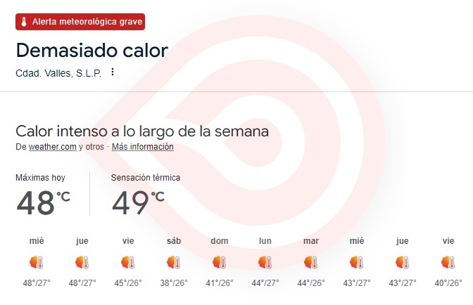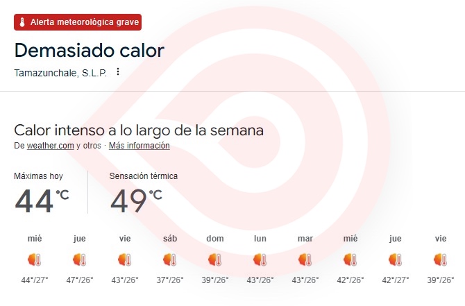 En Tamazunchale la alerta era parecida por demasiado calor y se anunció que será el mismo contexto durante la presente semana, de 44 grados a 49 la percepción térmica, en Ciudad Valles, que se agravó por falta de energía eléctrica, cuyo apagón dejó a las familias sin recursos para mitigar el calor en cuartos climatizados, con la temperatura que alcanzó 48 grados y con una percepción térmica de 49 grados, con la tendencia que durante la semana alcanzaría los cincuenta grados.