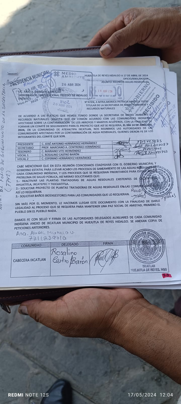 Concluyó que, en la zona de Ixcatlán se tiene un drenaje que no cuenta con una planta tratadora de aguas residuales, por ello; se pide al gobierno en turno que construyan una planta tratadora para que las aguas negras no afecten a las comunidades “hasta el momento no se tiene una respuesta de parte de la presidencia, pedimos que acudan para hacer una inspección ocular de la problemática”.