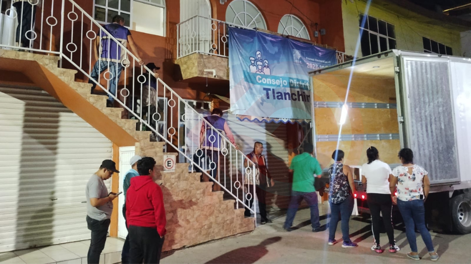 Tlanchinol, Hgo.- Al filo de las once de la noche y con la presencia de los representantes de los diferentes partidos políticos, jurídico y personal del Instituto Estatal Electoral de Hidalgo, a la cabecera del distrito 03 arribó el material electoral para la jornada del próximo 2 de junio.