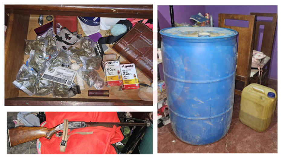 Durante las diligencias, los agentes lograron la detención de una persona del sexo masculino que responde a las iniciales J. C. R. C., a quien le aseguraron 160 dosis de supuesta marihuana, 37 dosis droga sintética tipo “cristal” y un arma de fuego larga con 83 cartuchos útiles calibre 22.