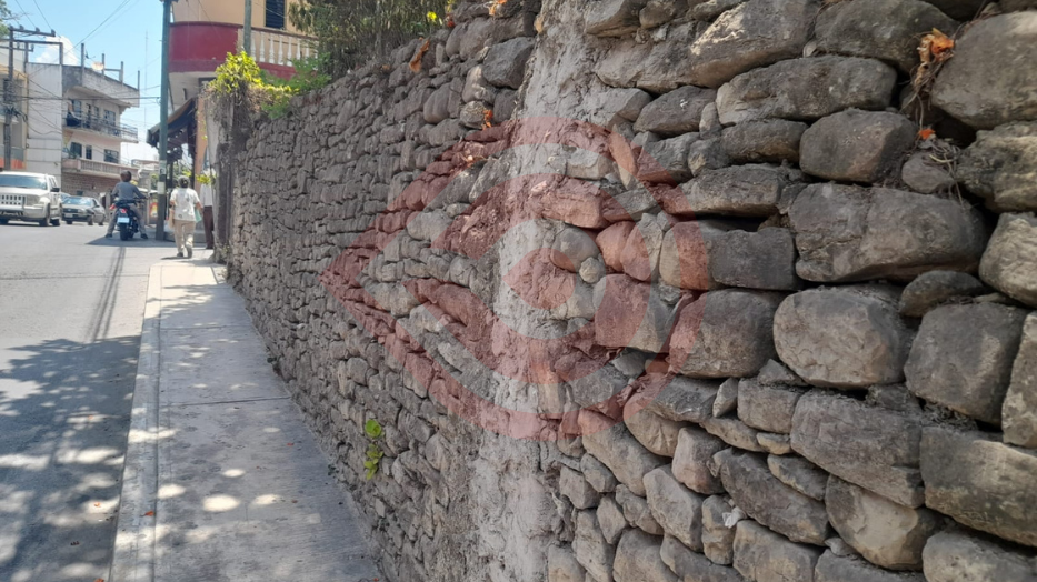 La antigua y clásica pared pétrea perimetral, se encuentra en la avenida Campeche, de la colonia 5 de Mayo, la cual es un riesgo latente para los transeúntes, ya que la mole de piedra representa serios y visibles daños.