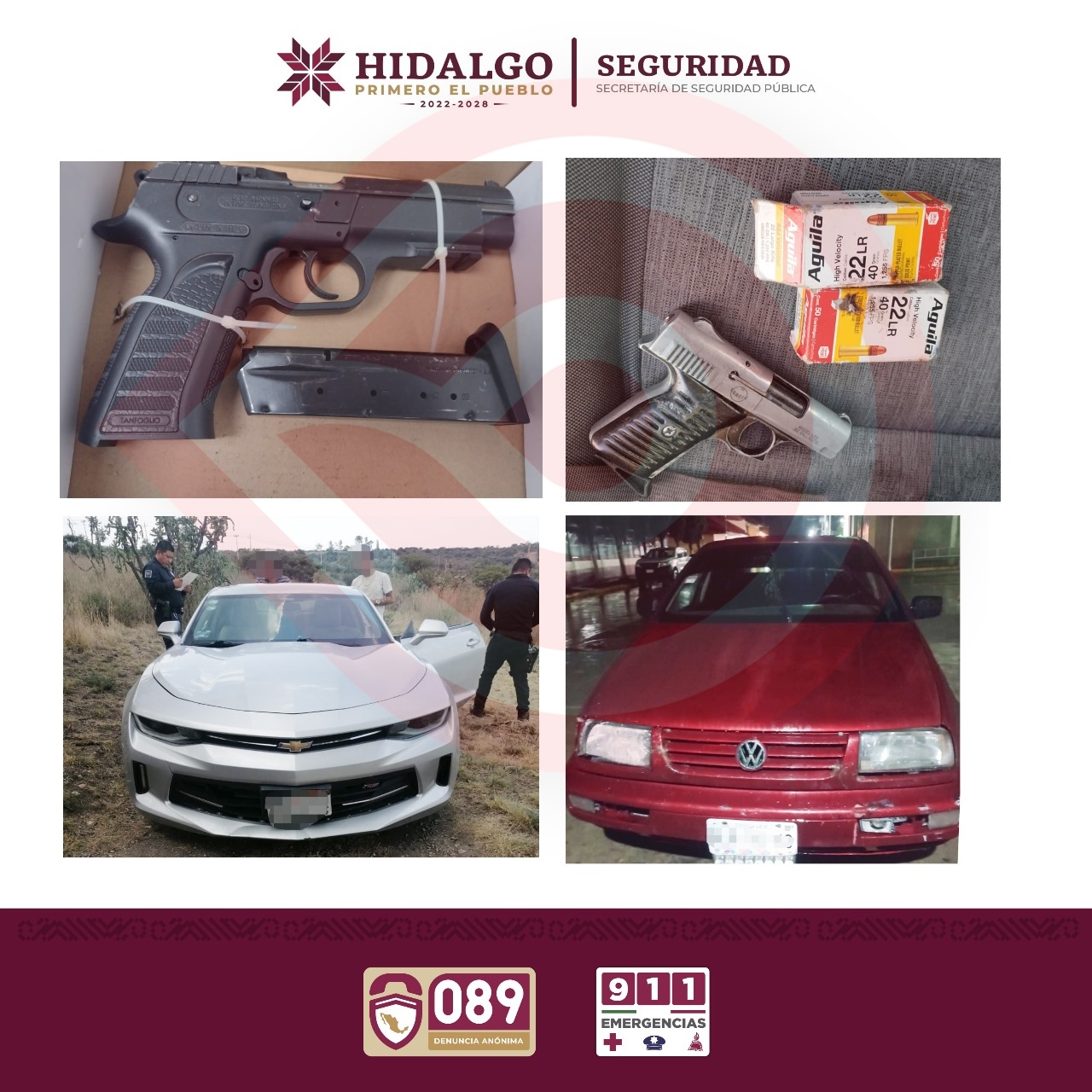 En tanto, en Tepeji del Río, vecinos del fraccionamiento Jardines de San Miguel reportaron a dos hombres que se encontraban ingiriendo bebidas alcohólicas en la vía pública, por lo que al arribar al lugar y al realizar la revisión de rutina, los agentes les hallaron un arma de fuego corta calibre 380, sin licencia, al interior de su vehículo.