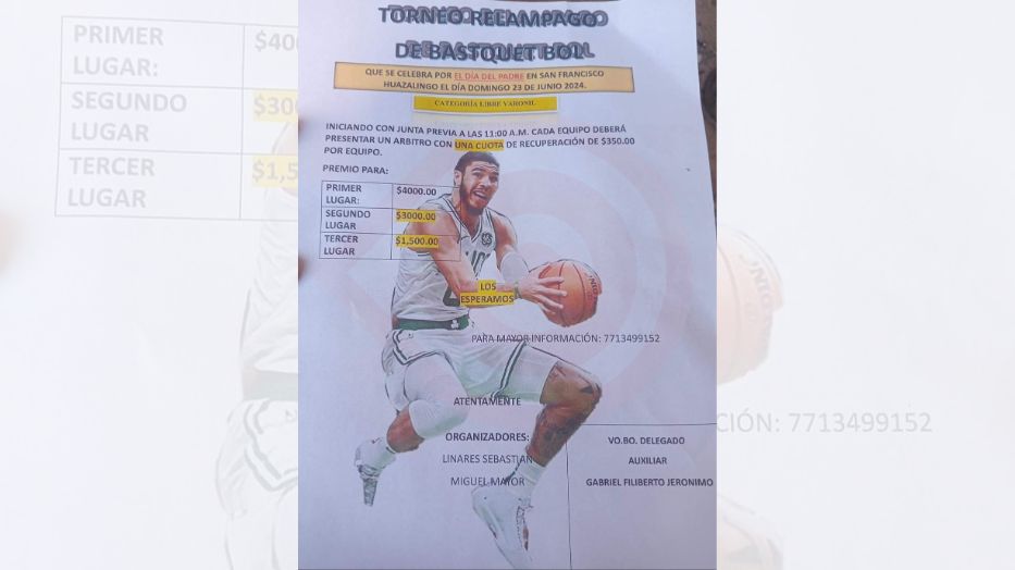 Huazalingo, Hgo.- La comunidad de San Francisco invita al torneo de básquetbol relámpago, el día 23 de junio, con motivo del festejo del día del padre en categoría libre varonil.