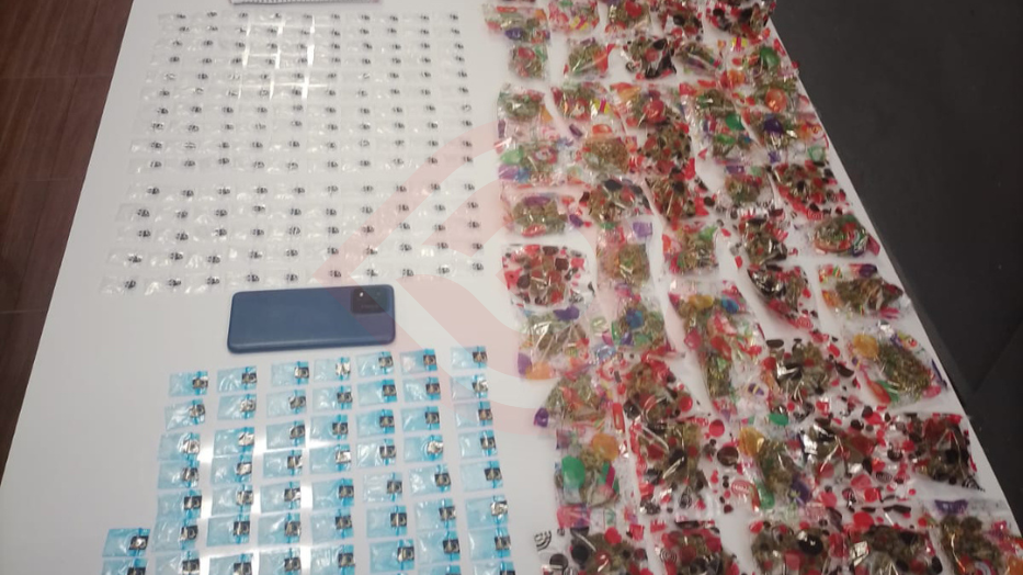La sospechosa, quien se identificó como G. M. F. R., de 28 años, tenía en posesión 360 dosis de una sustancia granulada con las características de droga sintética (cristal), 95 de hierba, presumiblemente marihuana, y 75 de polvo blanco similar a la cocaína.