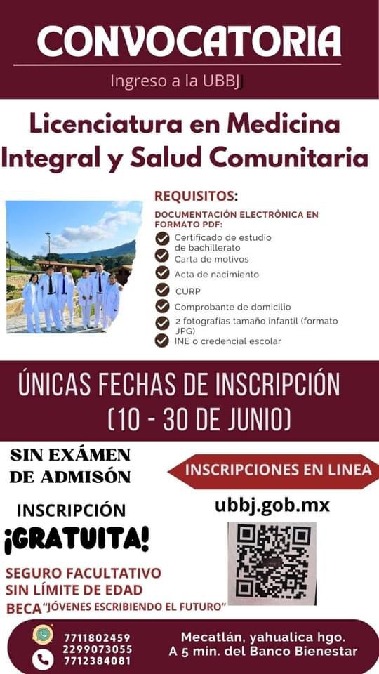 Yahualica, Hgo.- la Universidad para el Bienestar “Benito Juárez” convoca a la comunidad estudiantil que desee ingresar a su plantel Mecatlán.