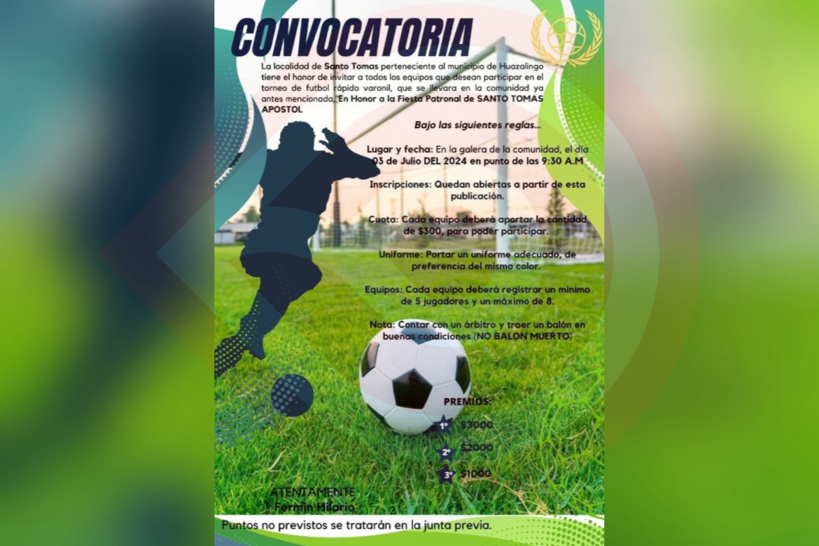 Por César Martínez/Zunoticia Huazalingo, Hgo.- Para fomentar el deporte en la juventud y con motivo de celebración la comunidad de Santo Tomás, se invita a todos los amantes del fútbol a reunir sus equipos e inscribirse al torneo que estará próximo a realizarse, el día 3 de julio en punto de las 9:30 a.m. Interesados… Seguir leyendo Convocatoria abierta de Torneo de Fútbol Rápido