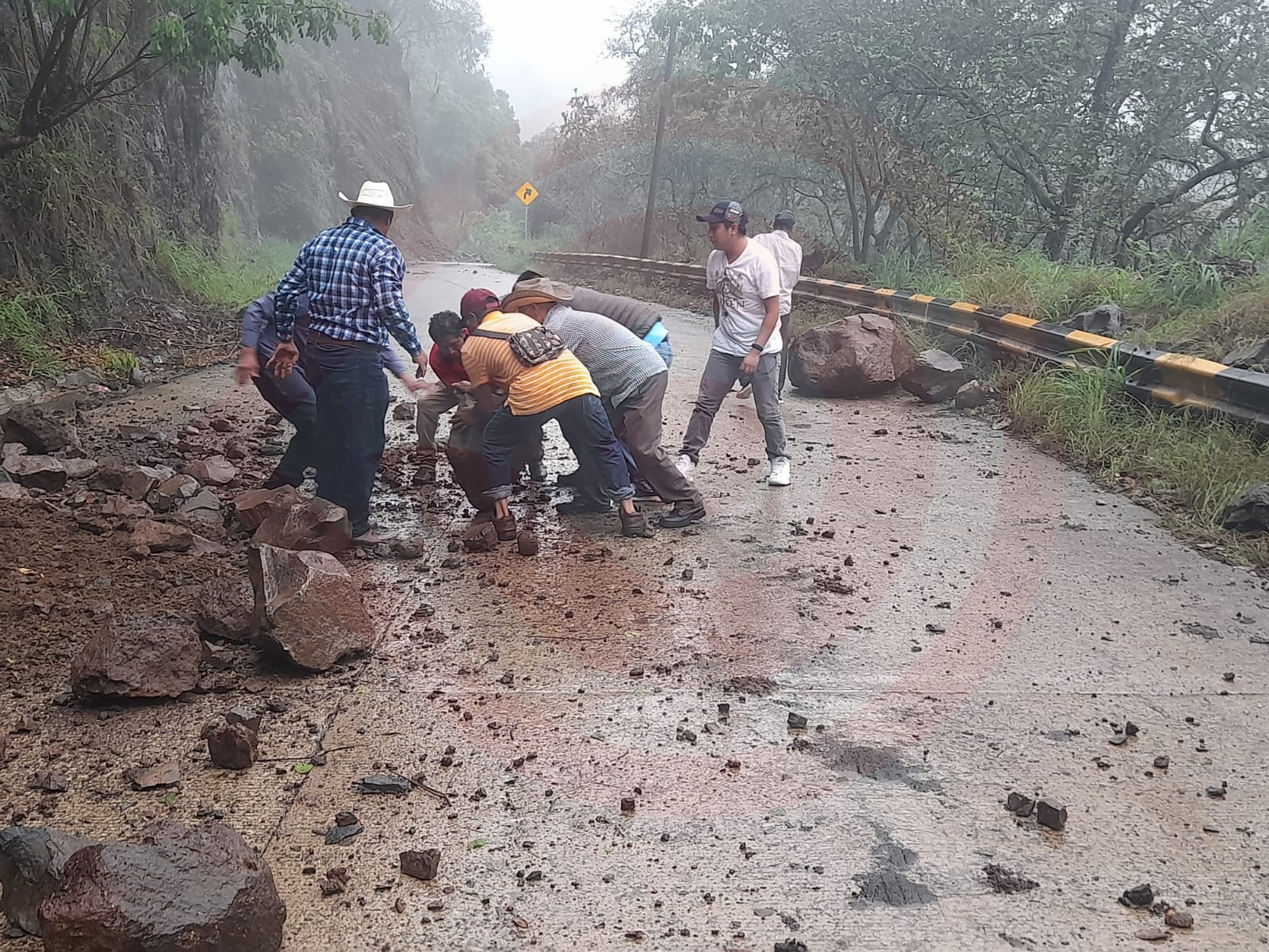 Por tal motivo, el conductor detuvo la marcha de la unidad y solicitó el apoyo de los viajeros para retirar de la carretera la más pequeña de los dos enormes piedras y así poder continuar el trayecto hacia Huejutla.
