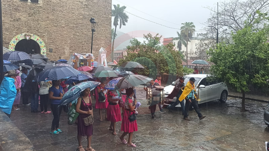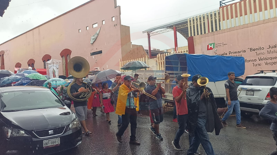 Cubriéndose en todo momento con paraguas y plásticos, la procesión de fieles católicos participó en esta actividad con motivo de la fiesta patronal de su poblado.