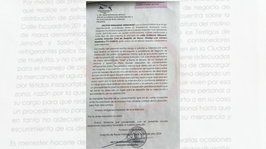 Los vecinos dijeron a Zunoticia “Se hace del conocimiento a las autoridades municipales, de salud y a la ciudadanía en general del foco de infección que se está viviendo en la colonia Aviación Civil, sobre la calle Escuadrón 201 debido a que existe un terreno que ha sido rentado a una empresa (se desconoce la razón social) que se dedica a comercializar pollos congelados, mismos que reparten en Huejutla y la región, no cuentan con las instalaciones adecuadas de higiene para almacenar dichos productos perecederos, el olor que desprende es insoportable, aunado a la gran cantidad de moscas que genera”.