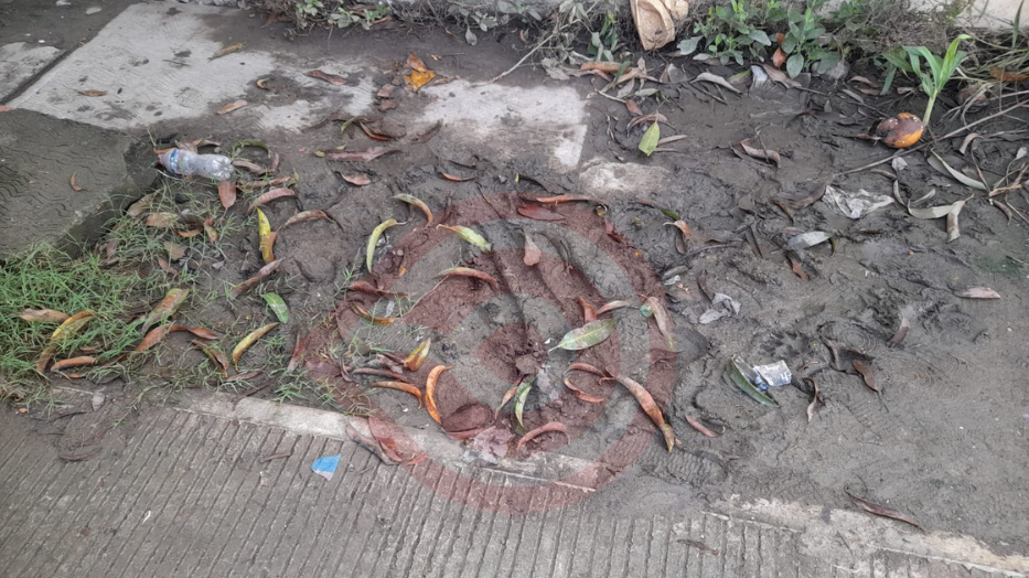 Manguera de agua doblada bajo registro sanitario, genera lodazal
