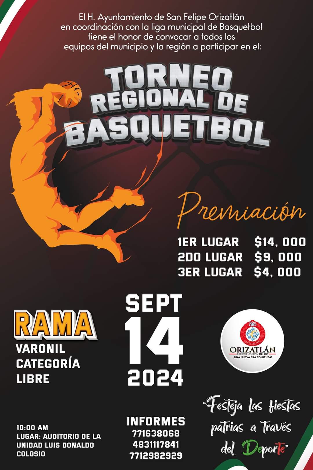 San Felipe Orizatlán, Hgo.- El H. Ayuntamiento de San Felipe Orizatlán, encabezado por el Dr. Carlos César Pérez Escamilla, a través de la Liga Municipal de Básquetbol, invita a participar en el Torneo de Básquetbol de Fiestas Patrias 2024.