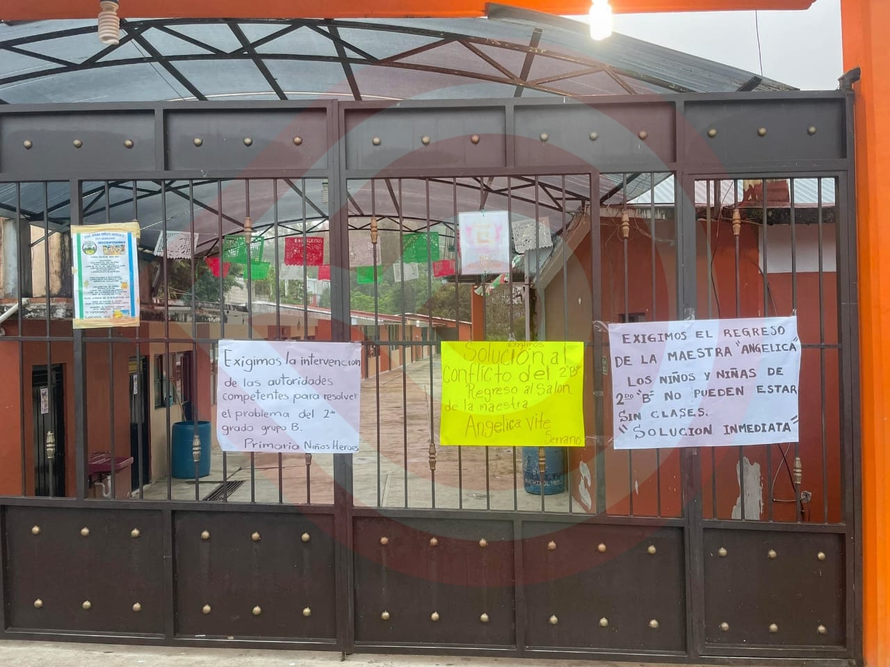 La manifestación se llevó a cabo la mañana de este miércoles en el acceso a la mencionada escuela, en donde se dieron cita madres de familia, quienes colocaron cartulinas en el portón y decidieron cerrar la institución como protesta, exigiendo la salida de un maestro, al que acusan de conflictivo, y piden el regreso de la maestra Angélica de 2B.