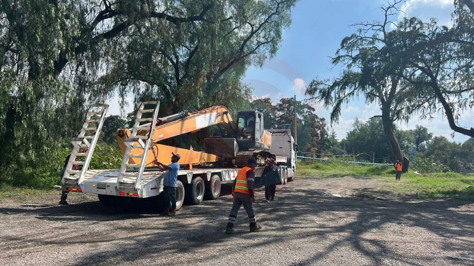 La excavadora de brazo largo de la Marina atiende el tramo en San Marcos, mientras que, de manera coordinada, la SIPDUS interviene aguas abajo de la confluencia del río Tlautla, a la altura de Ciudad Cooperativa Cruz Azul.