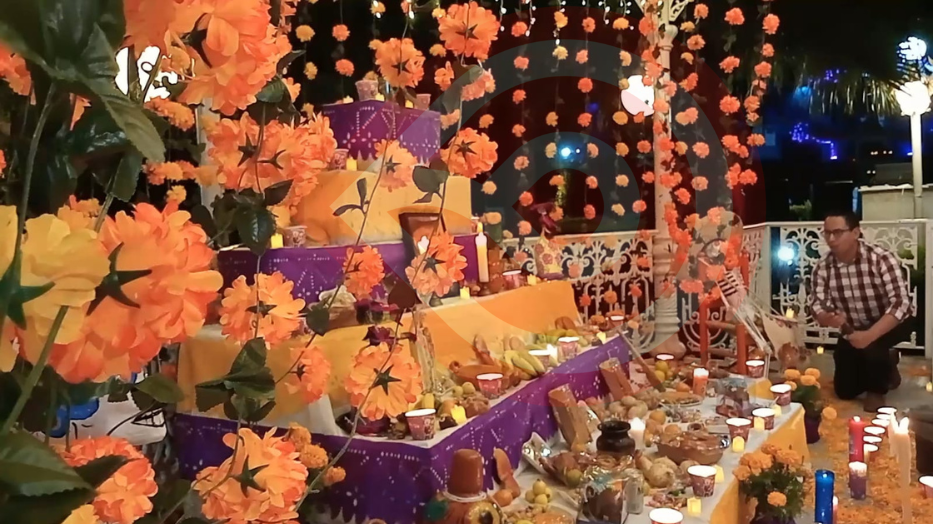 El altar, dividido en siete escalones, exhibió una variedad de ofrendas que incluyeron pan, guisados y frutas como manzanas, mandarinas y naranjas así mismo se colocaron veladoras y ceras, elementos que representan la luz que guía a las almas de los difuntos en su regreso.