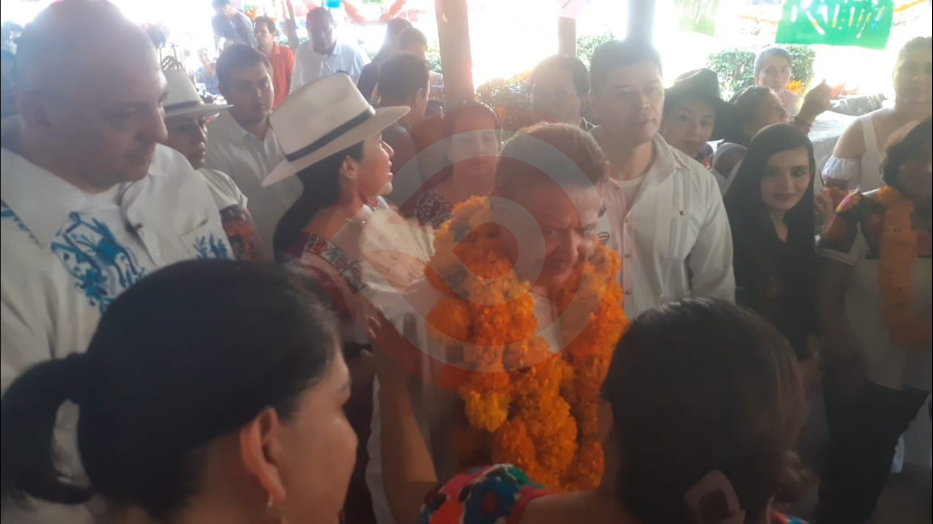 Les dio la bienvenida el presidente municipal José Alfredo San Román Duval y la presidenta del DIF municipal Hilda Kristel Rodríguez Flores; y realizaron un recorrido por las chozas construidas junto al magno escenario del Xantolo; recorrió el pasillo de las artesanías de barro de la comunidad de Chililico, Huejutla, Hidalgo.