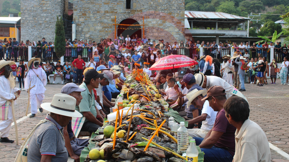 Como su nombre lo indica, varias mesas unidas que se colocan en el atrio de la iglesia, son saturadas de tamales que las mujeres de cinco sectores de la población elaboran, los cuales son recogidos por cinco vecinos llamamos “Kokolotsis”, para su posterior repartición a los asistentes, constituyendo el evento en una tradición única, por su forma de celebrarla, de las tantas que hay de carácter singular en la huasteca.