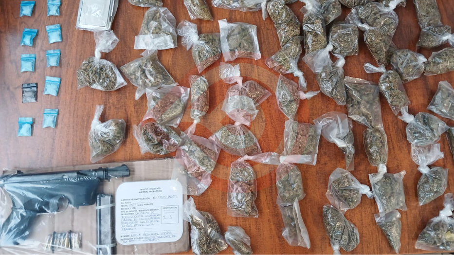 El sujeto, identificado con las iniciales A. M. G. de 48 años, tenía en posesión de 20 bolsas pequeñas de polvo con características propias de droga “cristal”, 58 bolsas de presunta marihuana, además de un arma de fuego corta, calibre 22 milímetros, con ocho cartuchos útiles.