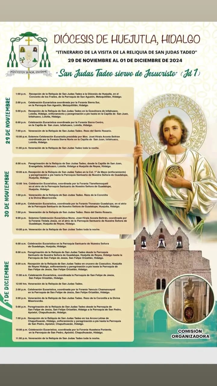 Explicaron que la visita de la Reliquia de San Judas Tadeo se ha programado del día 29 de noviembre al 1 de diciembre por las diversas Parroquias de la Diócesis de Huejutla.