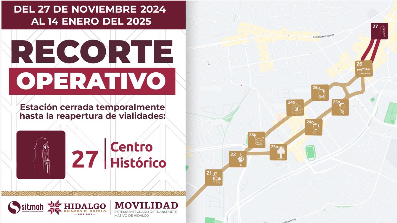 Por Redacción/Zunoticia Pachuca de Soto, Hgo.- La Secretaría de Movilidad y Transporte (Semot) a través de su organismo sectorizado el Sistema Integrado de Transporte Masivo de Hidalgo (SITMAH), informa que a partir del miércoles 27 de noviembre de 2024 y hasta el 14 de enero de 2025, se implementará un recorte operativo en la Ruta… Seguir leyendo Estación Centro Histórico permanecerá cerrada por preparativos y festividades decembrinas