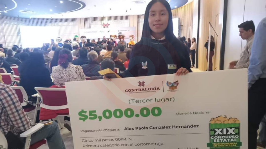 Jaltocán, Hgo.- El Colegio de Bachilleres del Estado de Hidalgo (COBAEH) plantel Jaltocán, se siente orgulloso de contar con estudiantes tan talentosos y comprometidos como Alex Paola González Hernández, quien obtuvo el tercer lugar en el XIX Concurso Nacional de Transparencia en Corto.