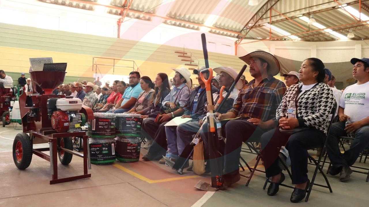 Se entregaron equipos agrícolas (herramientas, desbrozadora y mochilas fumigadoras), acuícolas (estanque de geomembrana) y pecuarios (paquetes de rollos de alambre, becerreras, ordeñadoras, molinos picadoras y módulos de sombra) a productoras y productores de los municipios de Alfajayucan, Chapantongo, Nopala de Villagrán, Tecozautla y Tepetitlán, mediante el Programa para Transformar el Campo.